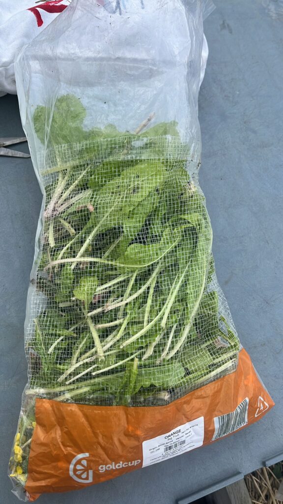 A generous picking of fresh spinach β€” tender leaves and stems, perfect for cooking down.