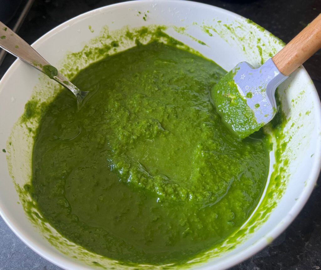 Blend the cooked spinach until smooth. This becomes the base for your dough and gives the noodles their colour and flavour.