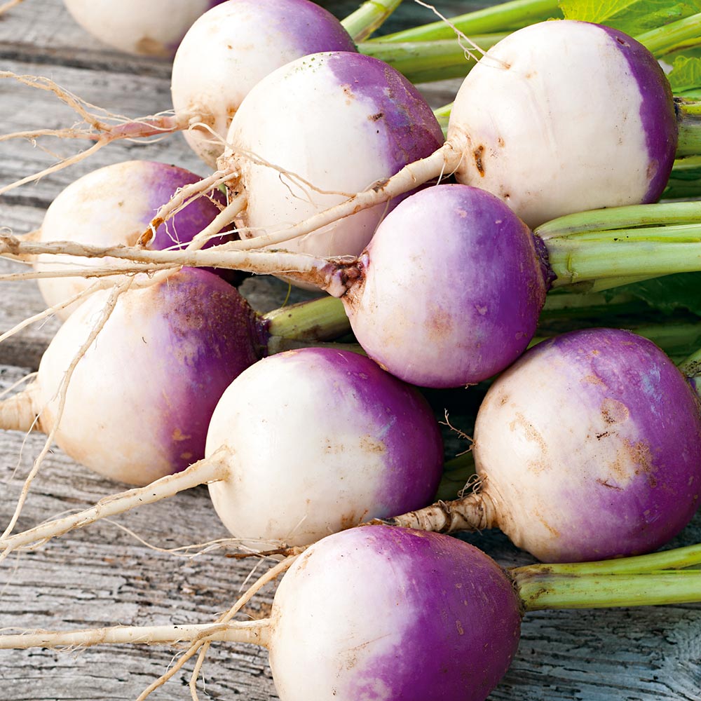 Smooth round, white roots with a bright purple flash on the top. The flesh is white throughout and extremely tender.